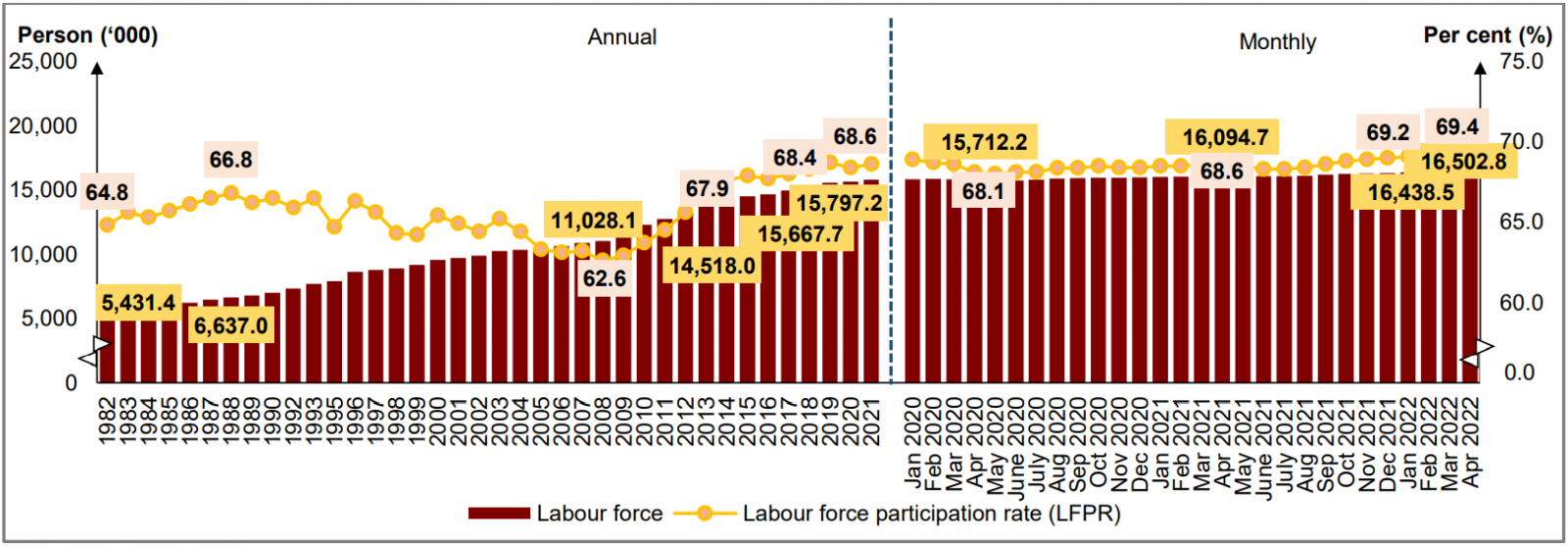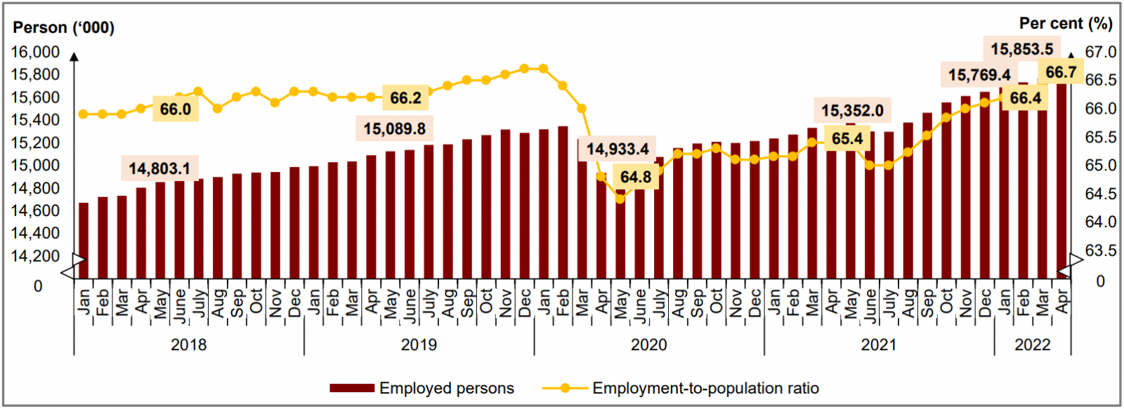 - In April 2022, the number of labour force recorded a surge of 0.4 per cent (+64.3 thousand persons) month-on-month to 16.50 million persons (March 2022: 16.44 million persons). Accordingly, April’s labour force participation rate (LFPR) strengthened further by 0.2 percentage points to 69.4 per cent (March 2022: 69.2%), indicating more labour participation in the market. In terms of seasonally adjusted estimates, the number of labour force increased by 0.4 per cent while LFPR rose by 0.3 percentage points.