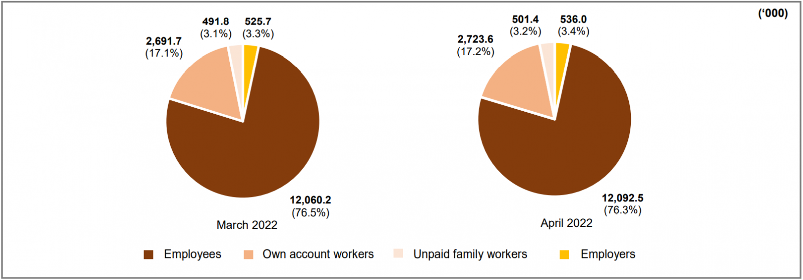 - The employee’s category which made up the largest composition of employed person at 76.3 per cent, improved by 0.3 per cent month-on-month to 12.09 million persons (March 2022: 12.06 million persons). Similarly, the own-account workers continued to increase with an addition of 31.9 thousand (+1.2%) persons to 2.72 million persons in April 2022 (March 2022: 2.69 million persons). The increase was partly due to more business activities in conjunction with the celebration of Ramadan and preparation for Aidilfitri during the month parallel with the reopening of international border which encouraged the tourism sector and tourism-related industries to resume their activities.