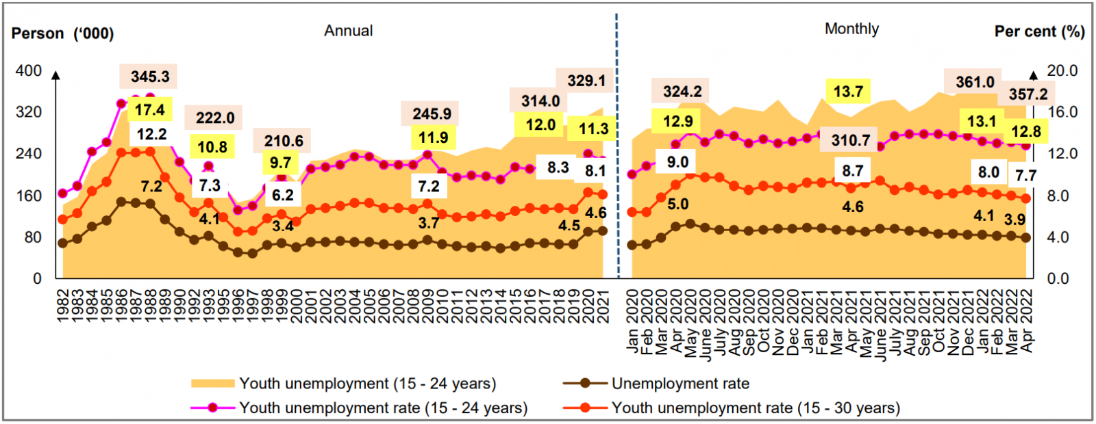 The unemployment rate for youth aged 15 to 24 years edged down by 0.3 percentage points to 12.8 per cent with the number of unemployed youths lessened by 3.8 thousand persons or 1.1 per cent to record 357.2 thousand persons (March 2022: 361.0 thousand persons). Likewise, the unemployment rate for youth aged 15 to 30 years decreased by 0.3 percentage points to 7.7 per cent, with the number of unemployed youths declining by 0.2 per cent (-1.2 thousand persons) of to 501.2 thousand persons (March 2022: 8.0%; 502.4 thousand persons). [Chart 5]