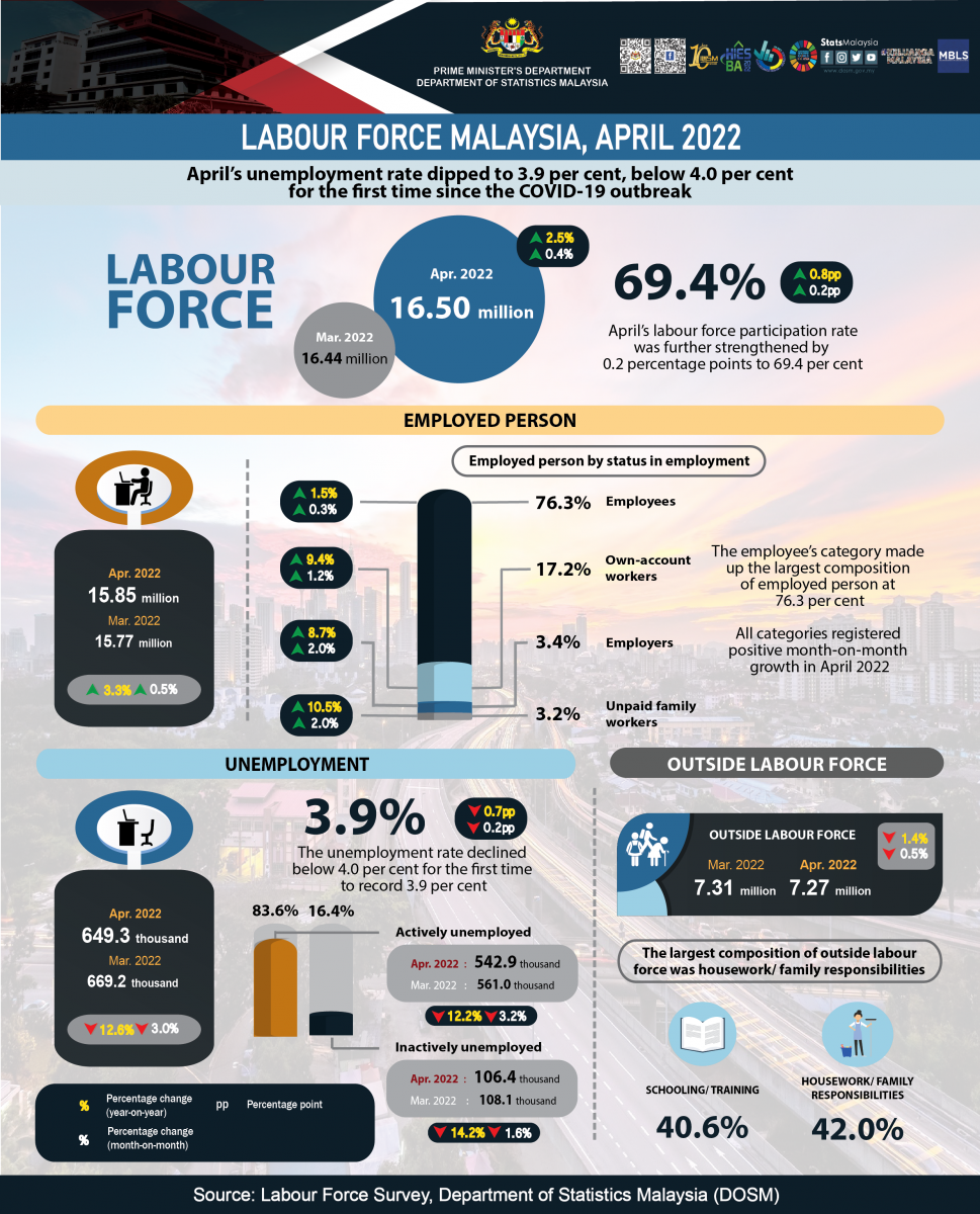 - In April 2022, the number of unemployed persons continued to trend down for nine consecutive months, registering a fall of 3.0 per cent or equivalent to 19.9 thousand persons to 649.3 thousand unemployed persons (March 2022: 669.2 thousand persons). Meanwhile, on a seasonally adjusted terms, the number of unemployed persons went down by 4.1 per cent. Hence, the unemployment rate declined to below 4.0 per cent for the first time to record 3.9 per cent (March 2022: 4.1%) after two years of the COVID-19 pandemic in the country. Seasonally adjusted estimates for the April’s unemployment rate indicated a month-on-month decline by 0.2 percentage points to 3.9 per cent.