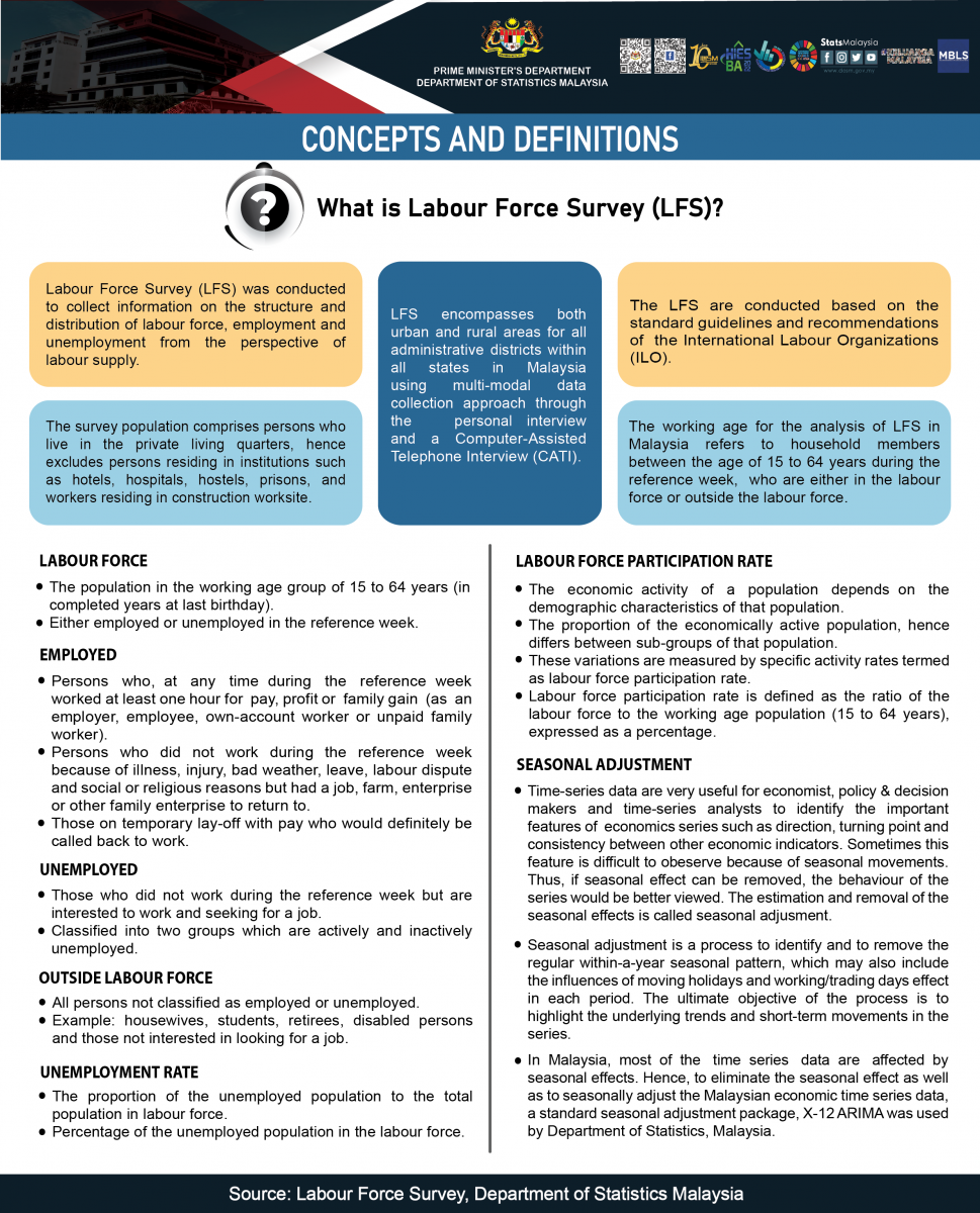 Starting with the monthly release of the Principal Statistics of Labour Force, Malaysia, January 2016, the principal statistics of labour is estimated based on the current population estimates as compared to the previous series which used population projections based on the Population and Housing Census of Malaysia, 2010. This rebase is to obtain statistics that is more consistent with current population structure.