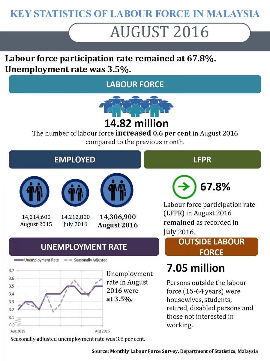 Labour force participation rate in August 2016 was 67.8 per cent, similar as recorded in July 2016.
