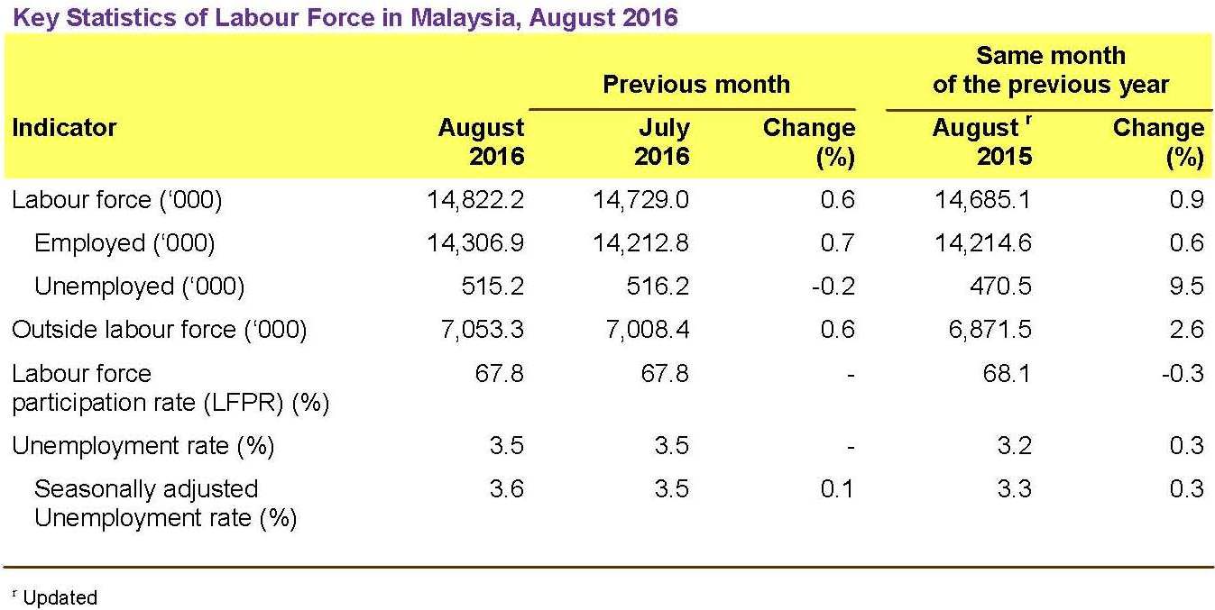 Unemployment rate for August 2016 was 3.5 per cent, same as registered in the previous month. Meanwhile year-on-year comparison, unemployment rate was 0.3 percentage points higher than in August 2015.