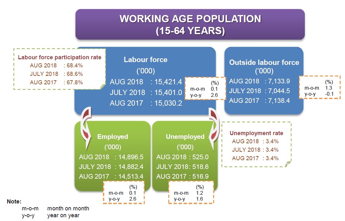Unemployment rate (seasonally adjusted) in August 2018 remained at 3.4 per cent as compared to the previous month.
