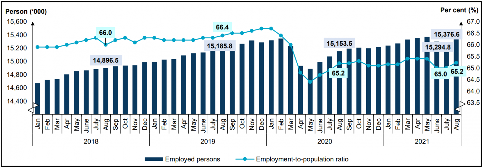 - Employed persons rose by 81.8 thousand persons to 15.38 million persons in August 2021 (July 2021: 15.29 million persons) after declining for two consecutive months. During the month, the employment-to-population ratio which indicates the ability of an economy to create employment picked up by 0.2 percentage points to 65.2 per cent (July 2021: 65.0%).