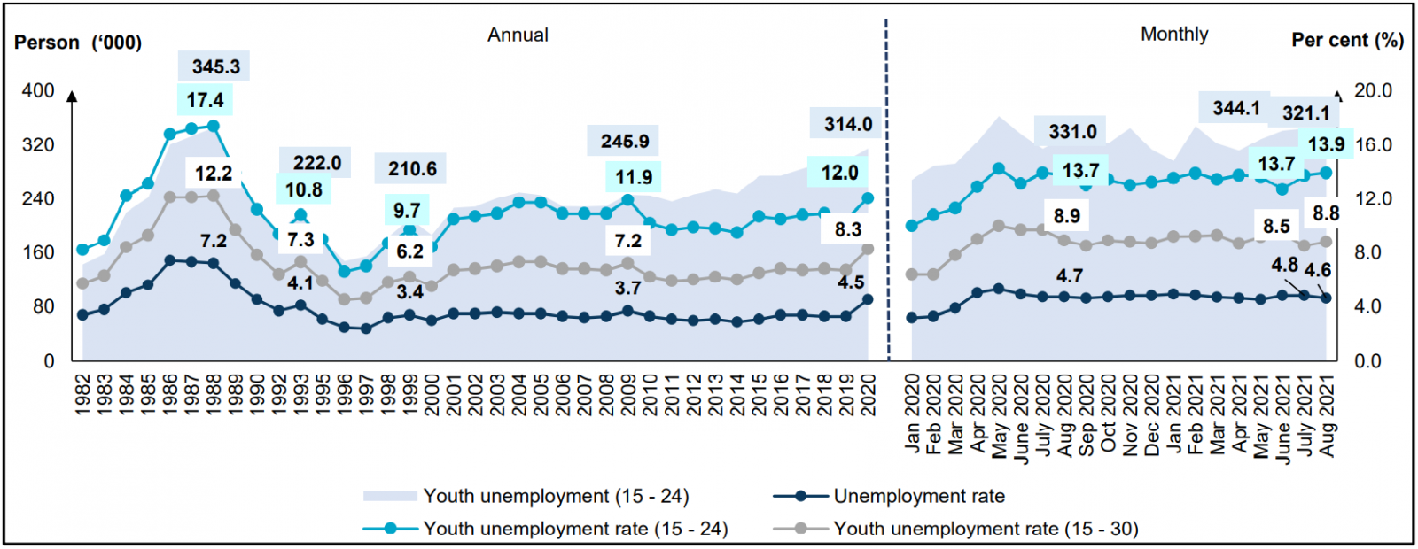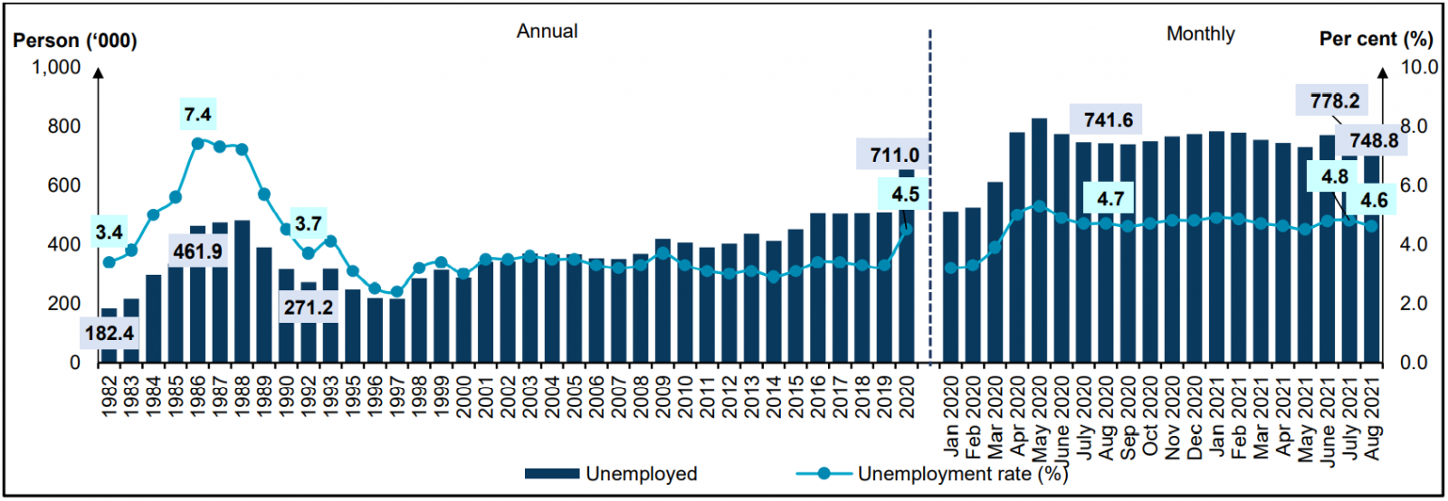 Chart 3: Unemployed persons and unemployment rate, 1982 - 2020 and January 2020 - August 2021