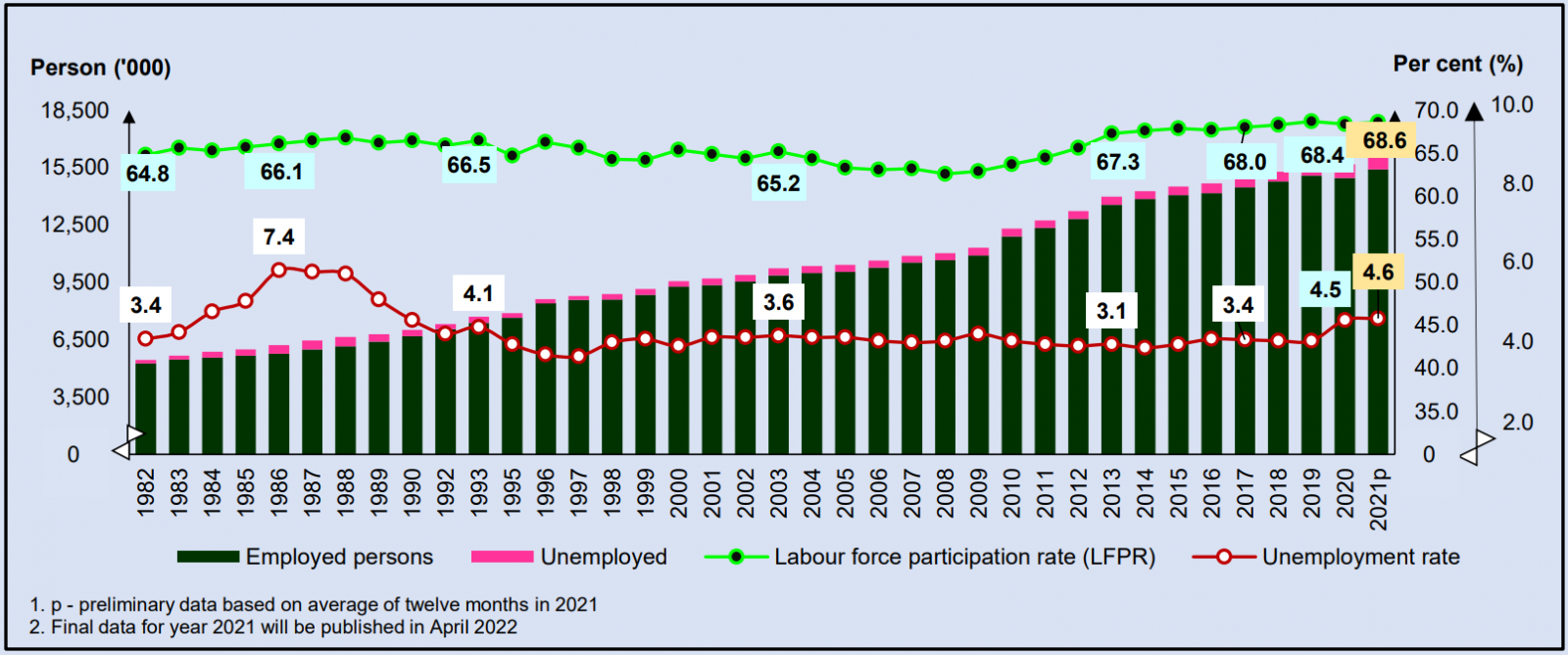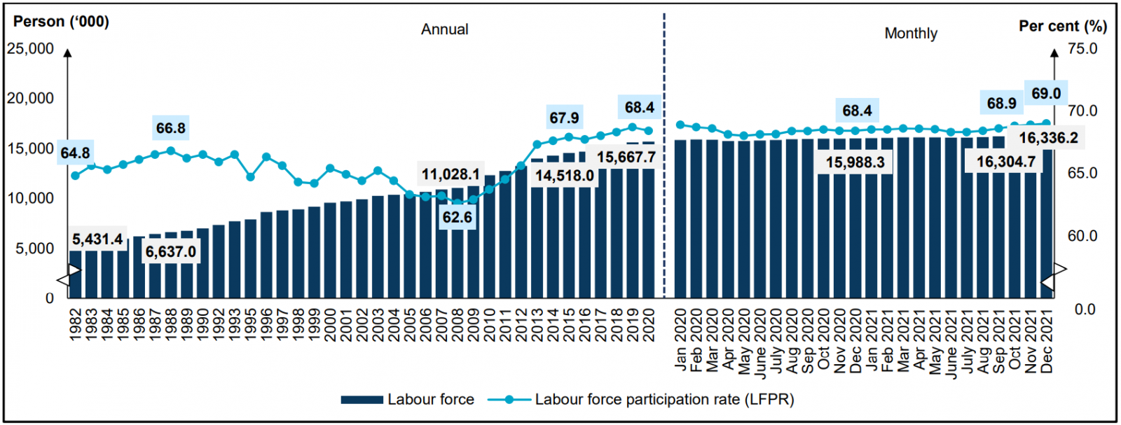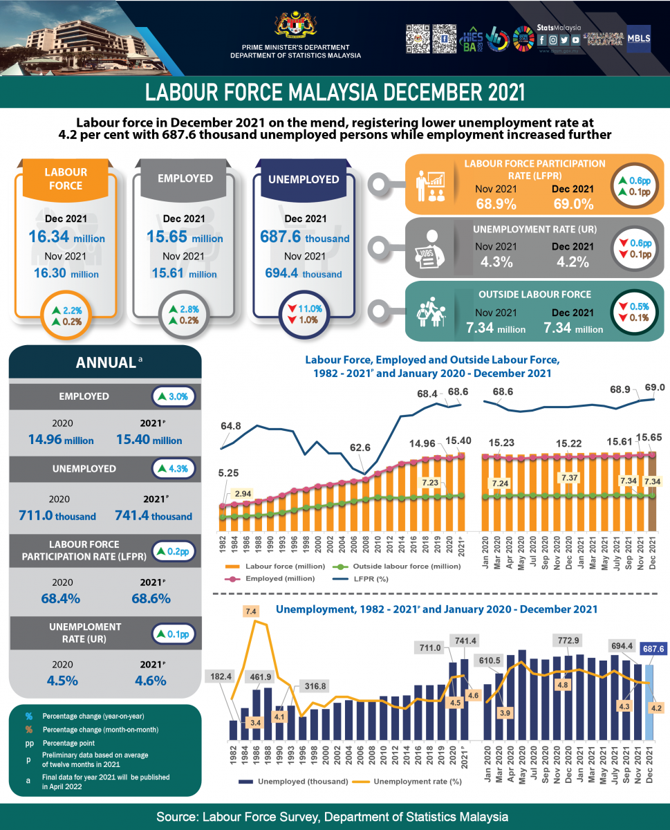 - Towards the end of the year, the number of labour force rose by 31.5 thousand persons or 0.2 per cent to 16.34 million persons (November 2021: 16.30 million persons). Accordingly, the labour force participation rate (LFPR) in December 2021 went up to 69.0 per cent (November 2021: 68.9%), the highest LFPR recorded since January 2020. This situation signalled the people’s optimism towards the labour market, thus prompted them to search for jobs.