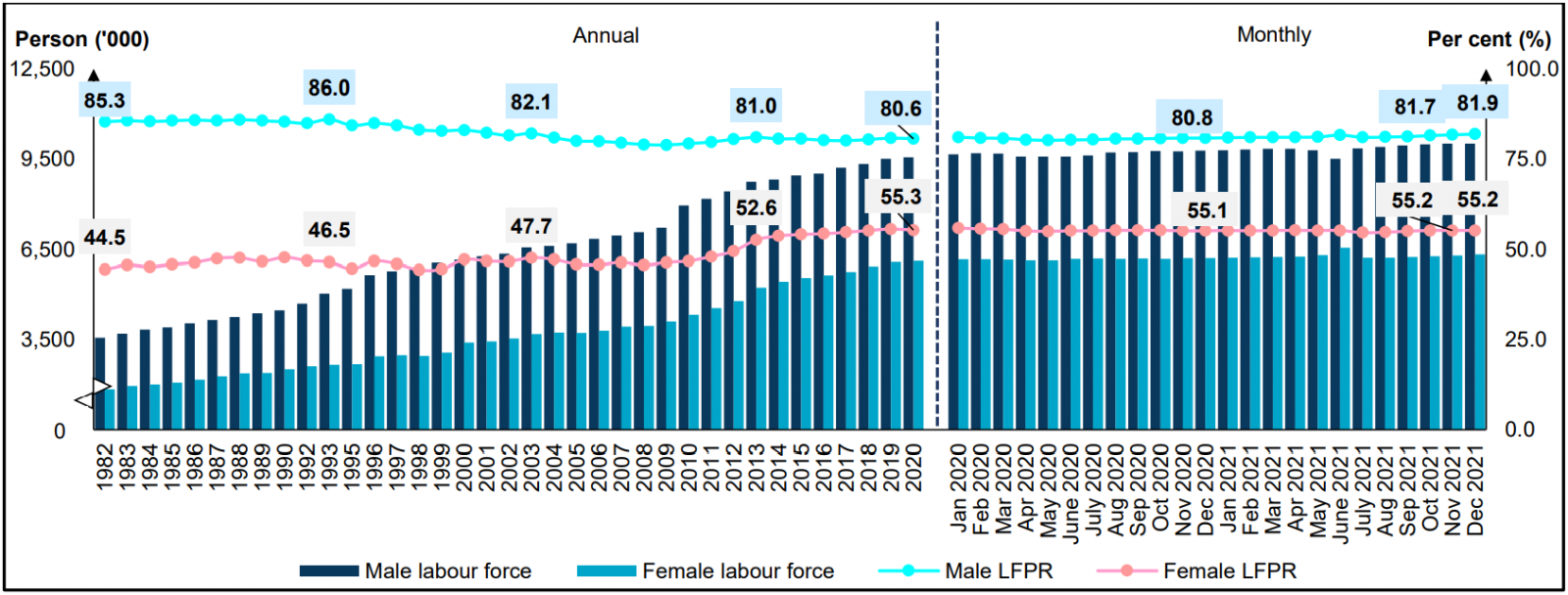 Chart 7: Labour force and LFPR by sex, 1982 - 2020 and January 2020 - December 2021