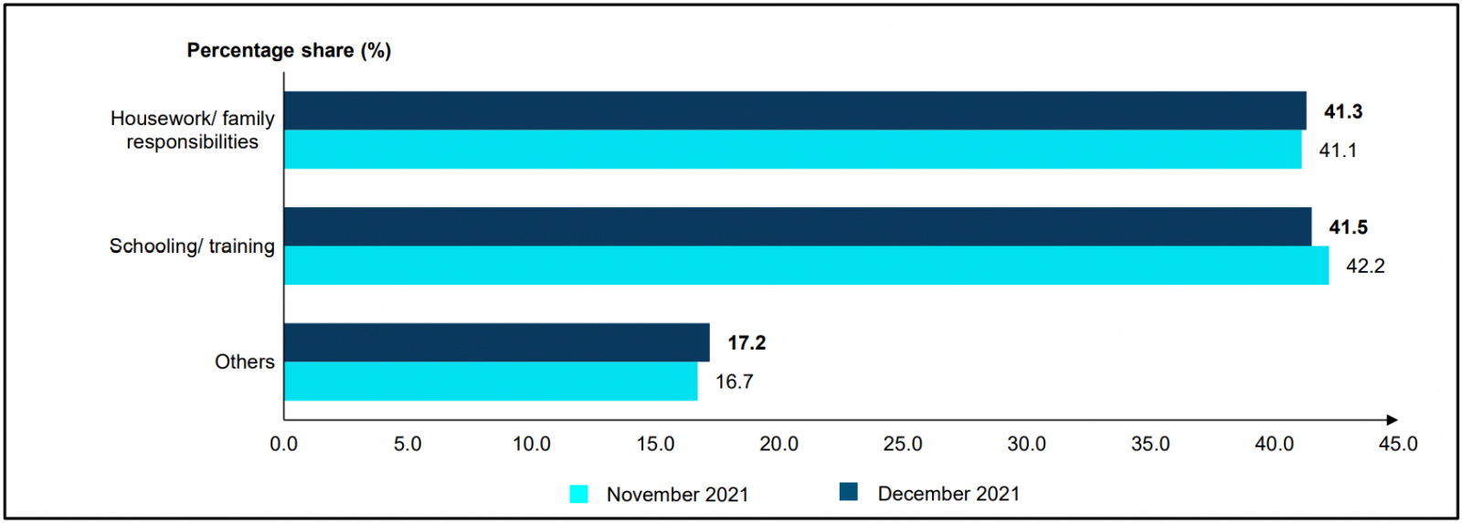 - In December 2021, the decline in the number of outside labour force endured, lessening by 6.7 thousand persons (0.1%) to 7.34 million persons (November 2021: 7.34 million persons). The largest composition of the outside labour force was due to schooling/ training with a share of 41.5 per cent and tailed by housework/ family responsibilities category with 41.3 per cent.