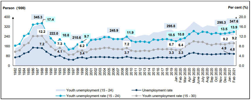 The unemployment rate for youth aged 15 to 24 years, increased by 0.4 percentage points to 13.9 per cent in February 2021. The number of unemployed youths increased by 52.4 thousand persons to 347.6 thousand persons as against the previous month (January 2021: 295.3 thousand persons). In the meantime, the unemployment rate for youth aged 15 to 30 years remained at 9.2 per cent. [Chart 5]