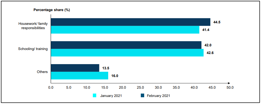 - Outside labour force in February 2021 registered an additional of 5.2 thousand persons to 7.37 million persons as against the previous month. The largest share of outside labour force was due to housework/ family responsibility with a share of 44.5 per cent or 3.28 million persons and followed by schooling/ training with 42.0 per cent or 3.09 million persons.