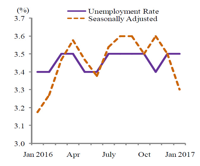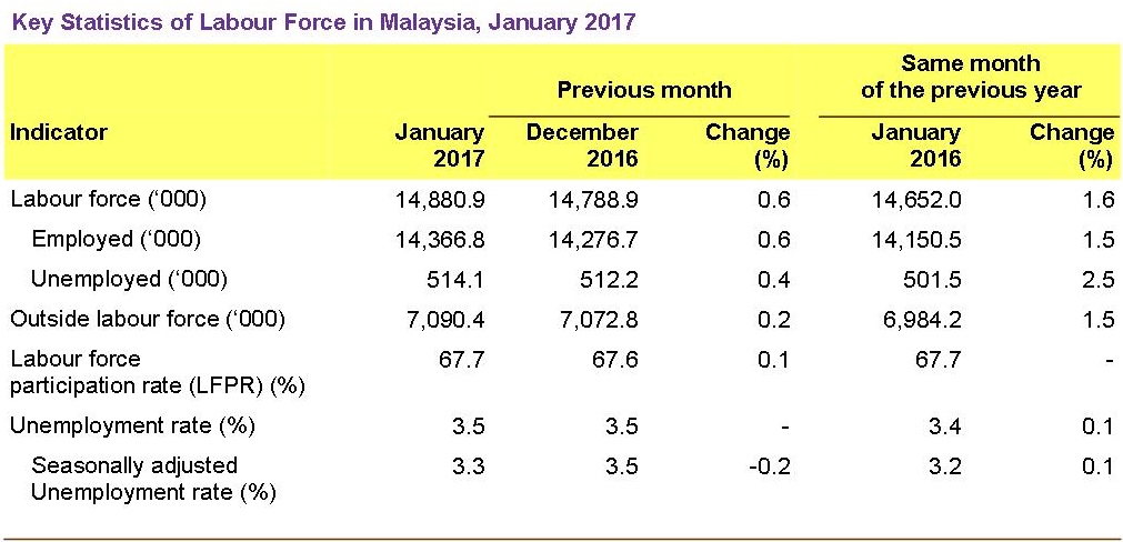 Unemployment rate for January 2017 remained unchange at 3.5 per cent. Meanwhile, year-on-year comparison, unemployment rate was 0.1 percentage points higher than January 2016.