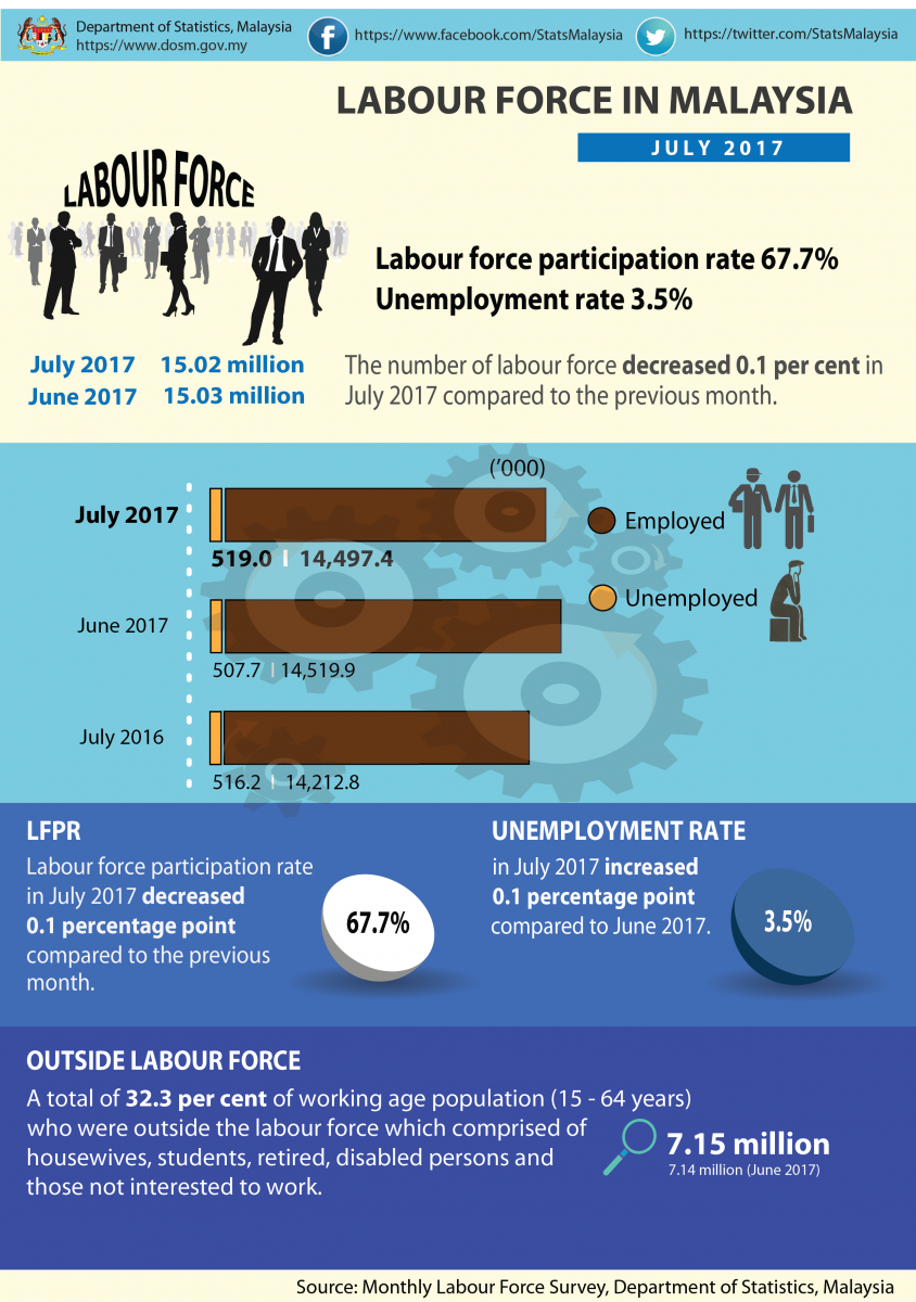 Unemployment rate for July 2017 was 3.5 per cent, an increase of 0.1 percentage point compared to the previous month. Meanwhile, year-on-year comparison, the rate did not record any change.