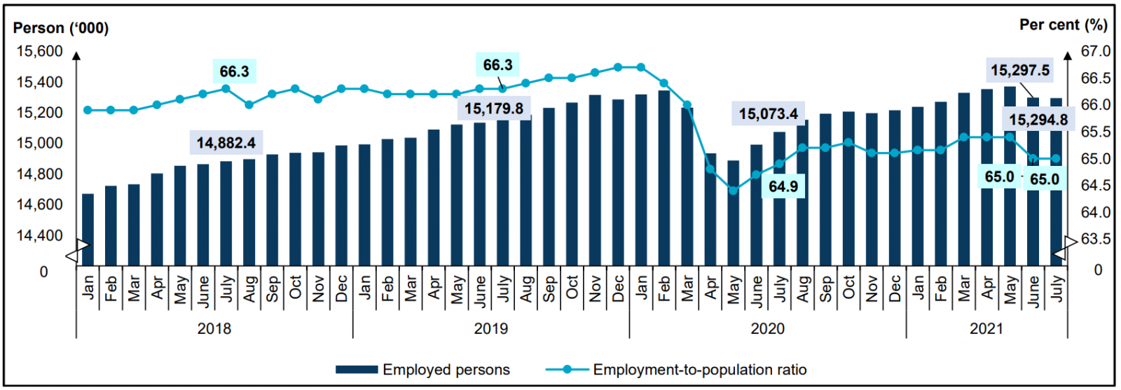 Chart 1: Employed persons and employment-to-population ratio, January 2018 - July 2021