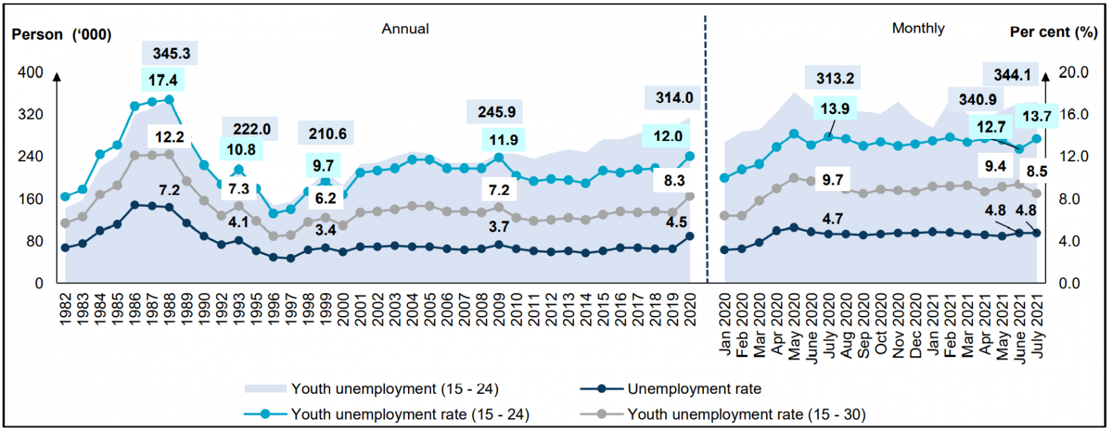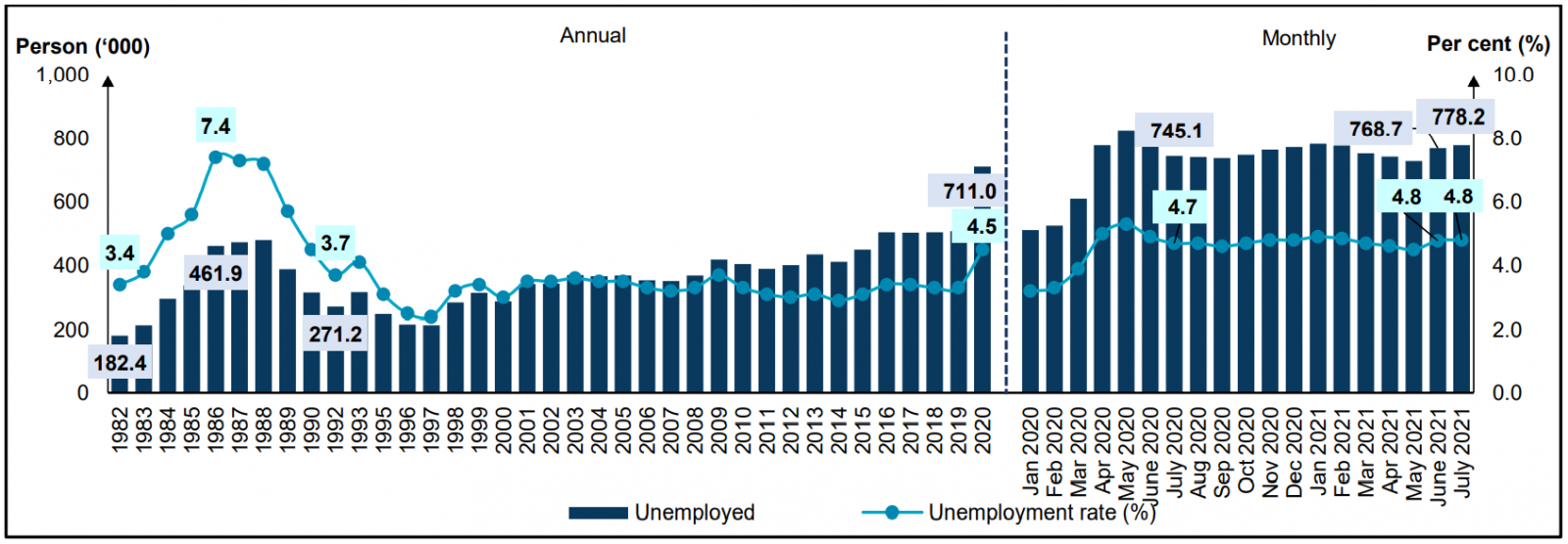 Chart 3: Unemployed persons and unemployment rate, 1982 - 2020 and January 2020 - July 2021