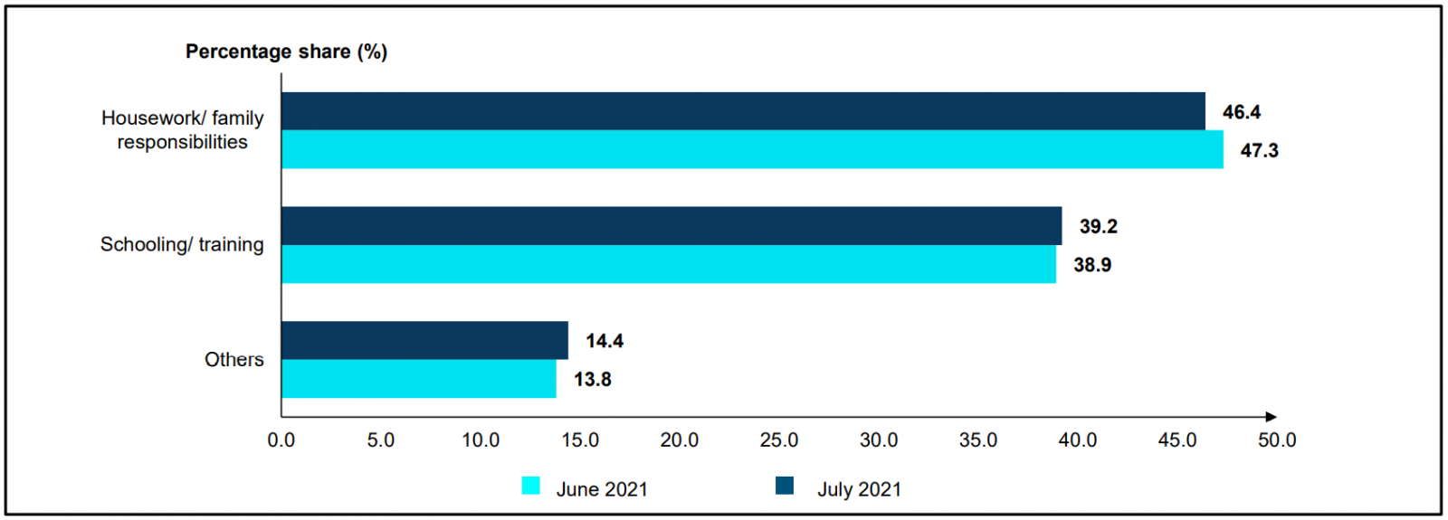 In July 2021, the number of outside labour force continued to increase for the fourth month by 0.3 per cent or 18.7 thousand persons to register 7.48 million persons (June 2021: 7.46 million persons). Similar trend was witnessed on the year-on-year basis whereby the number of outside labour force augmented by 75.6 thousand persons (1.0%). Housework/ family responsibilities was the major composition of outside labour force with a contribution of 46.4 per cent and followed by schooling/ training category (39.2%). [Chart 8]