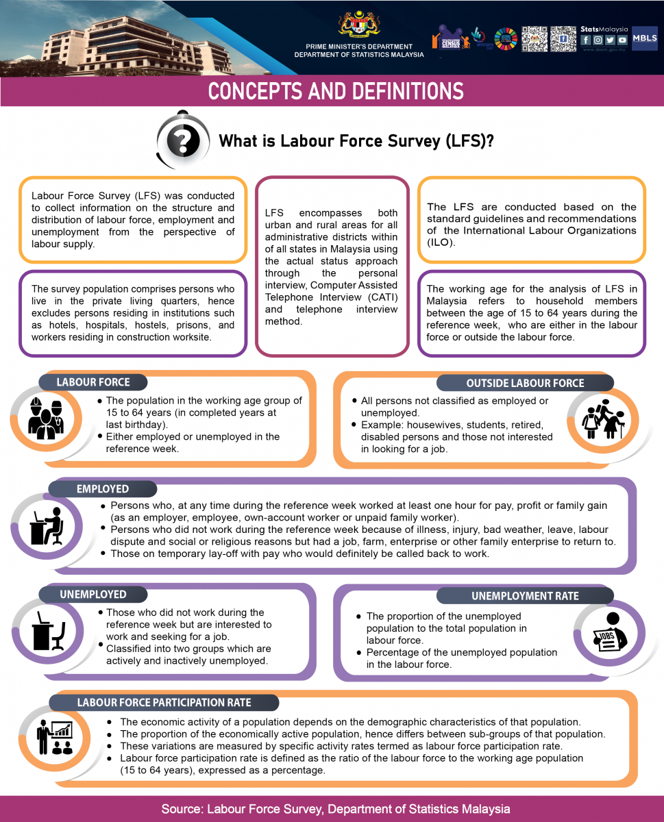 Starting with the monthly release of the Principal Statistics of Labour Force, Malaysia, January 2016, the principal statistics of labour is estimated based on the current population estimates as compared to the previous series which used population projections based on the Population and Housing Census of Malaysia, 2010. This rebase is to obtain statistics that is more consistent with current population structure.