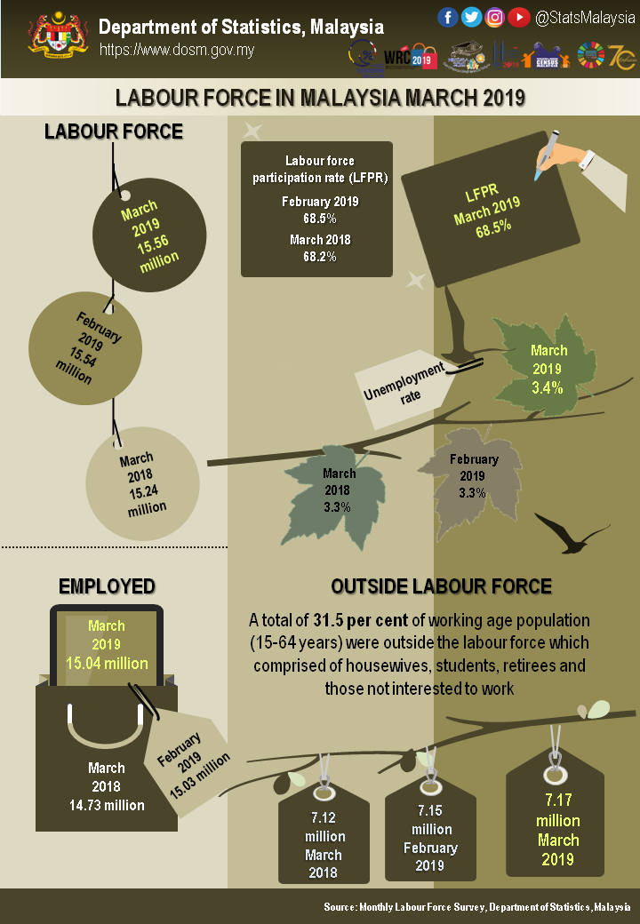 Starting with the monthly release of the Principal Statistics of Labour Force, Malaysia, January 2016, the principal statistics of labour is estimated based on the current population estimates as compared to the previous series which used population projections based on the Population and Housing Census of Malaysia, 2010. This rebase is to obtain statistics that is more consistent with current population structure.