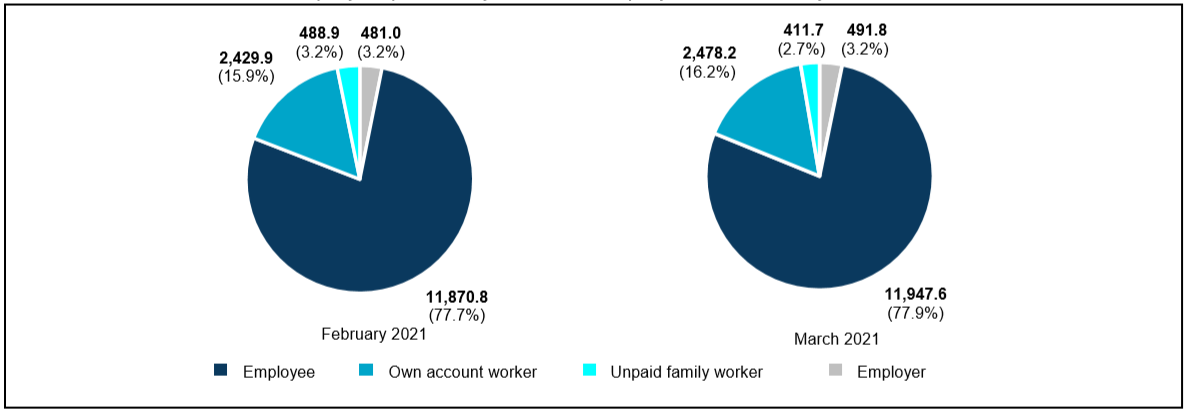 - The employee’s category was added by 76.8 thousand persons or 0.6 per cent to record 11.95 million persons in March (February 2021: 11.87 million persons). This category was the largest composition of employed person with a share of 77.9 per cent. A similar trend was observed in own-account workers encompassed 16.2 per cent, improved by 48.3 thousand persons to register 2.48 million persons in March (February 2021: 2.43 million persons).