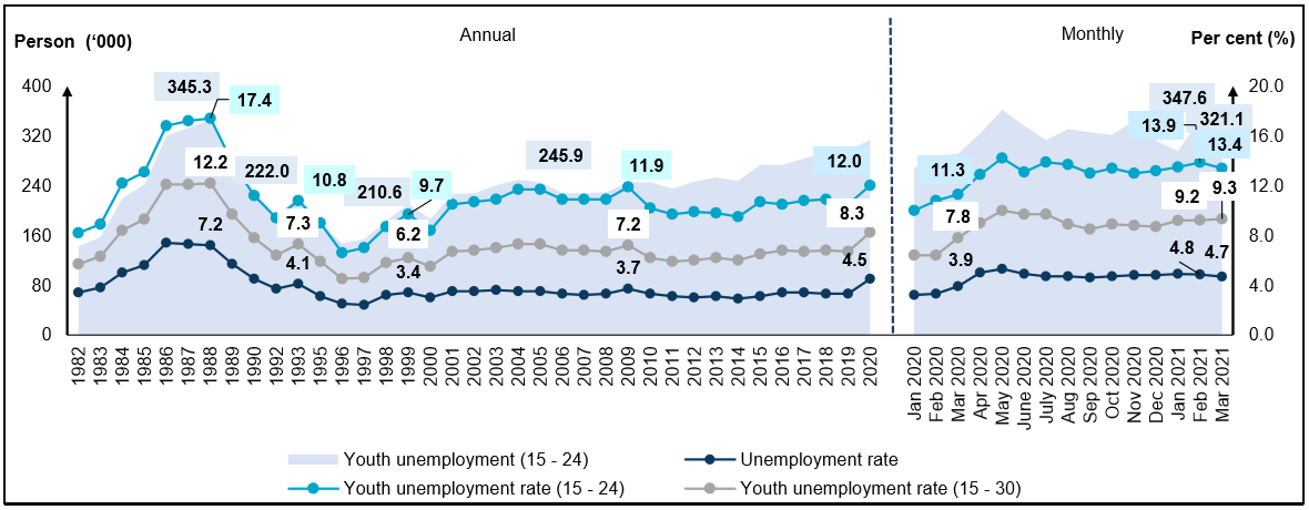 Chart 3: Unemployed persons and unemployment rate, 1982 - 2020 and January 2020 - March 2021