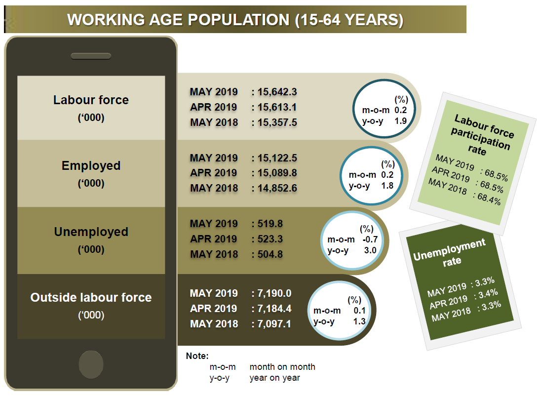 The labour force participation rate remained at 68.5 per cent since February 2019, but increased 0.1 percentage points as compared to the same month of previous year (May 2018: 68.4%).