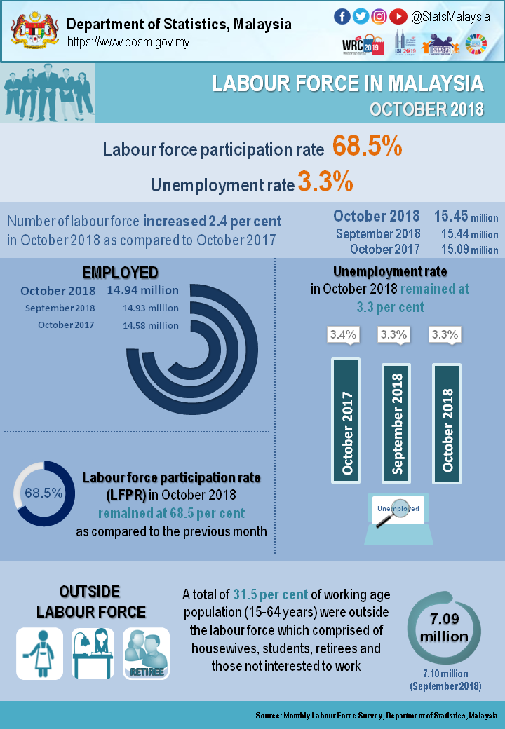 Unemployment rate (seasonally adjusted) in October 2018 also remained at 3.3 per cent.