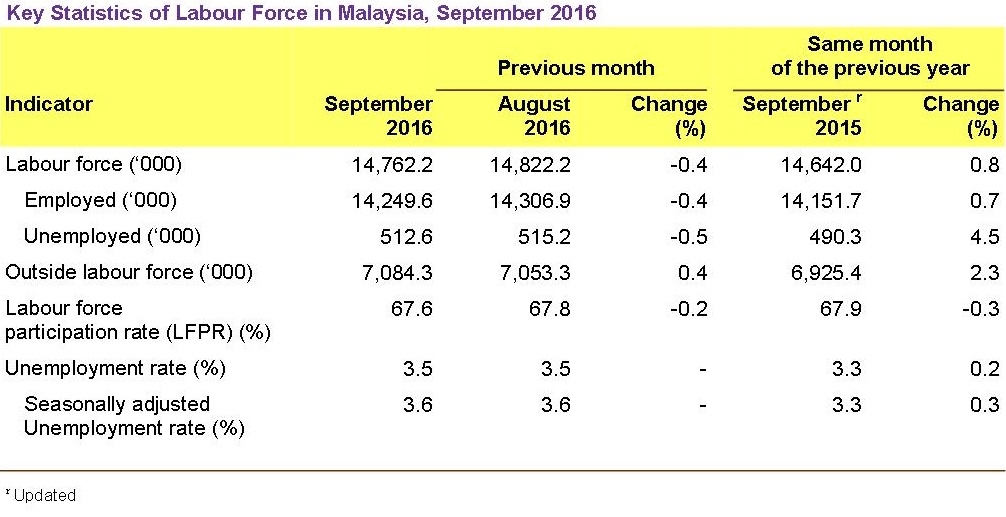 Unemployment rate for September 2016 was 3.5 per cent, same as registered in the previous month. Meanwhile year-on-year comparison, unemployment rate was 0.2 percentage points higher than September 2015.