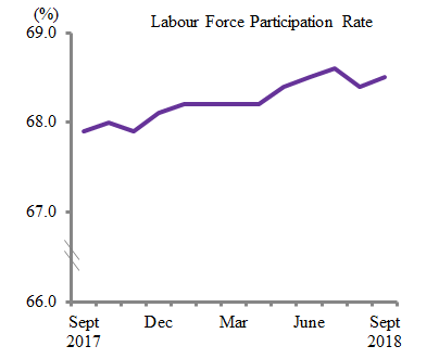 The labour force participation rate in September 2018 increased 0.1 percentage points to 68.5 per cent as compared to the previous month. On year-on-year basis, labour force participation rate increased 0.6 percentage points (September 2017: 67.9%).