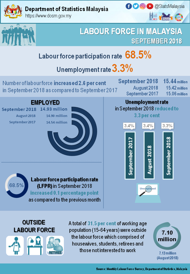 Starting with the monthly release of the Principal Statistics of Labour Force, Malaysia, January 2016, the principal statistics of labour is estimated based on the current population estimates as compared to the previous series which used population projections based on the Population and Housing Census of Malaysia, 2010. This rebase is to obtain statistics that is more consistent with current population structure.