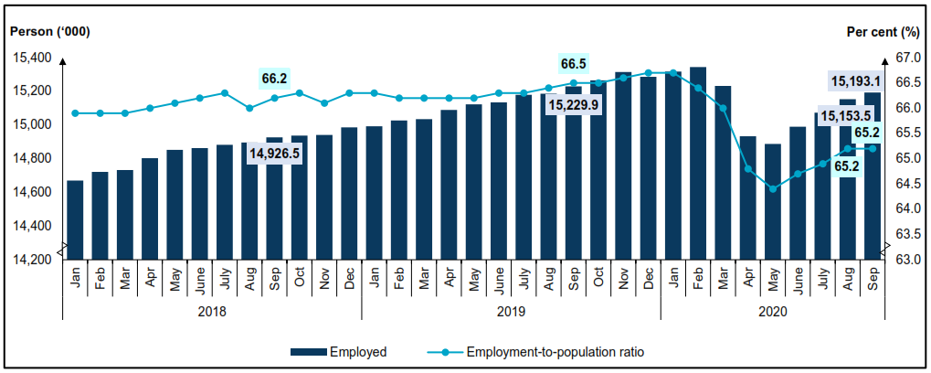 - In September 2020, employment continued to grow at a slower pace of 0.3 per cent (August 2020: 0.5%) to 15.19 million persons. The employment-to-population ratio remained at 65.2 per cent.