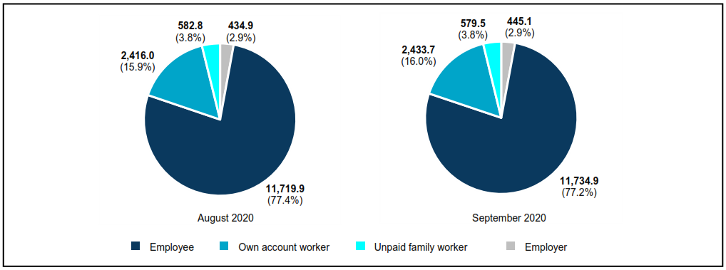 - In terms of status of employment, the employee’s category increased 14.9 thousand persons to record 11.73 million persons as against the previous month. Own-account workers continued to increase by 0.7 per cent to register 2.43 million persons (August 2020: 2.42 million persons).