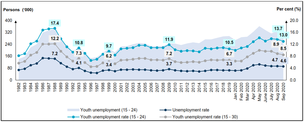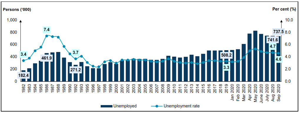 Chart 3: Unemployed persons and unemployment rate, 1982 - 2019 and January - September 2020