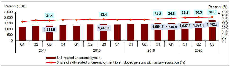 Through the LFS, skill-related underemployment is measured from the perspective of those with tertiary education and working in the semi-skilled and low-skilled occupations. Over the years, it was observed that the incidence of skill-related underemployment, had indicated the existence of some structural issue in the labour market prior to COVID-19 pandemic. This is portrayed by the quarterly average of 32.7 per cent or 1.4 million persons of skill-related underemployment during the period of Q1 2017 to Q4 2019. Incidentally, the current situation attributed to the continuous increase of skill-related underemployment to 36.8 per cent in the Q3 2020 after registering 36.5 per cent in Q2 2020. In terms of number, it increased to 1.76 million persons (Q2 2020:1.67 million persons). [Chart A2]