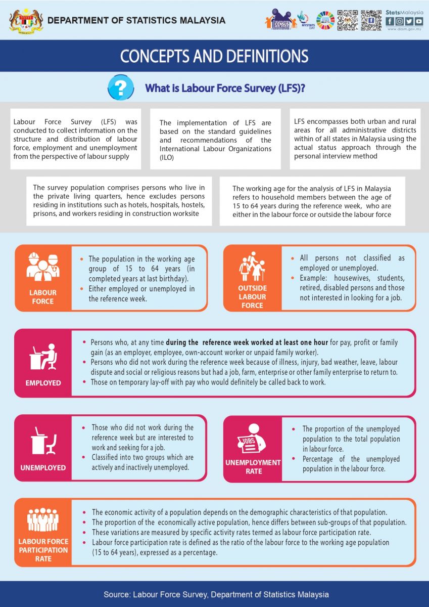 Starting with the monthly release of the Principal Statistics of Labour Force, Malaysia, January 2016, the principal statistics of labour is estimated based on the current population estimates as compared to the previous series which used population projections based on the Population and Housing Census of Malaysia, 2010. This rebase is to obtain statistics that is more consistent with current population structure.