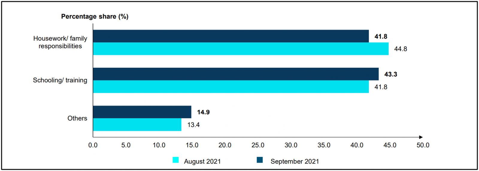 - The number of outside labour force continued to fall in September 2021 with a reduction of 42.6 thousand persons or 0.6 per cent registering 7.41 million persons (August 2021: 7.45 million persons). Schooling/ training was the major composition of outside labour force with 43.3 per cent and followed by housework/ family responsibilities category with 41.8 per cent.