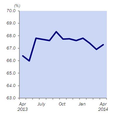 | Labour force participation rate marked at 67.3 per cent in April 2014, went up from 66.9 per cent in the previous month. The increase of 0.4 percentage point is an extension of the increase of population in the labour market by 0.5 per cent. Those people aged 20-24 years was the main contributor to this increment, that amounted to 103,700 persons. | Year-on-year comparison showed that the labour force participation rate was higher 0.9 percentage point than 66.4 per cent in April 2013. |