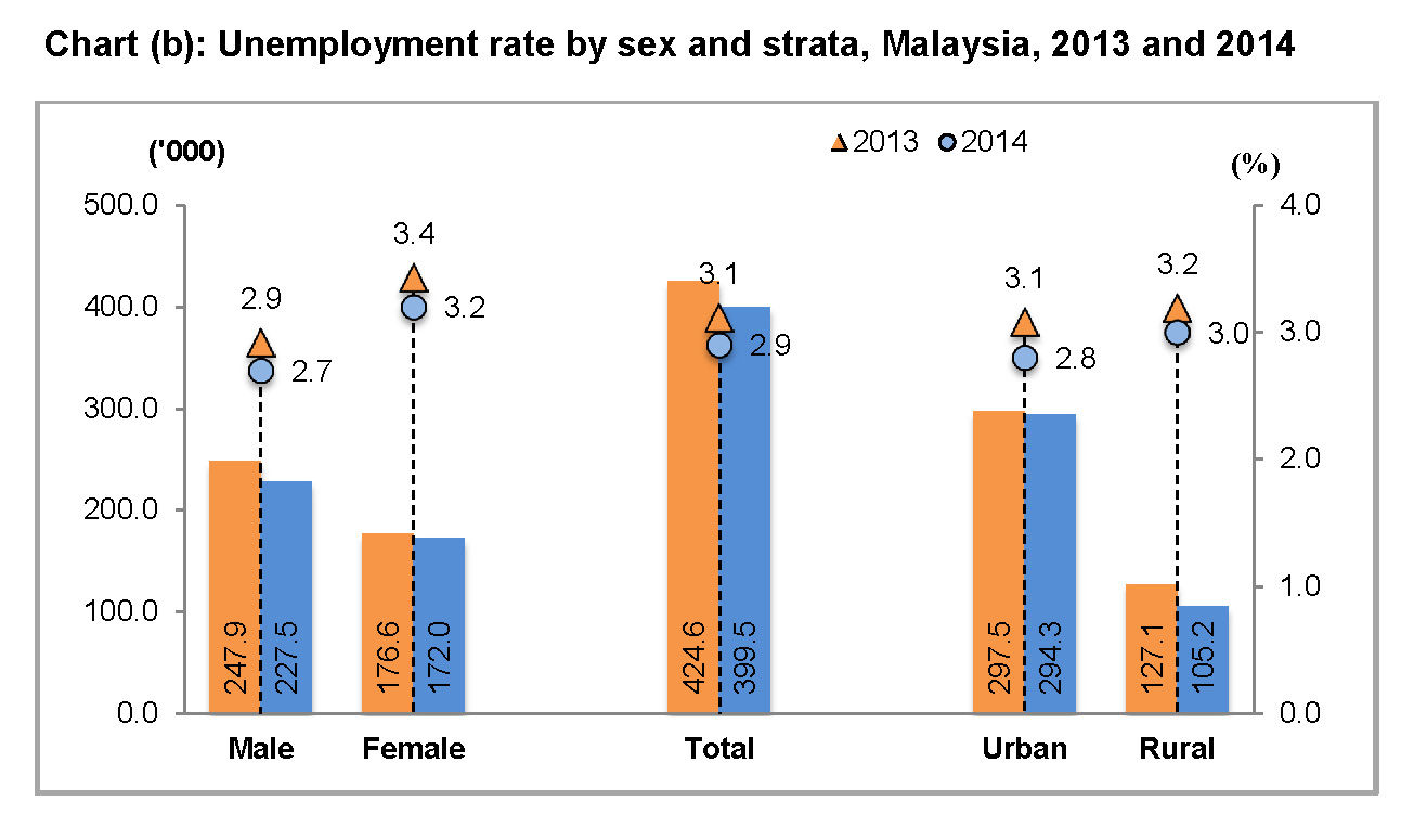 Female unemployment rate in 2014 recorded 3.2 per cent which is higher compared to male unemployment rate (2.7%). Nonetheless, the number of unemployed males was higher with 227.5 thousand persons compared to unemployed females (172.0 thousand persons).
