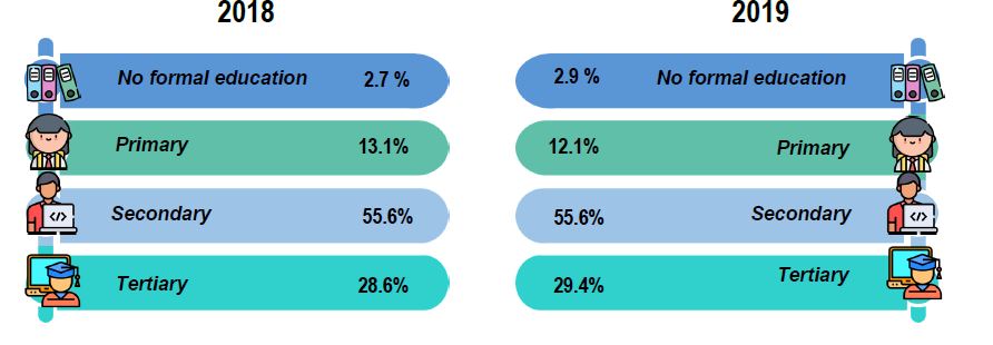 In 2019, the number of employed persons with tertiary education increased 0.8 percentage points to 29.4 per cent as against 28.6 per cent in the previous year. Meanwhile, employed persons with primary education declined 1.0 percentage points respectively.
