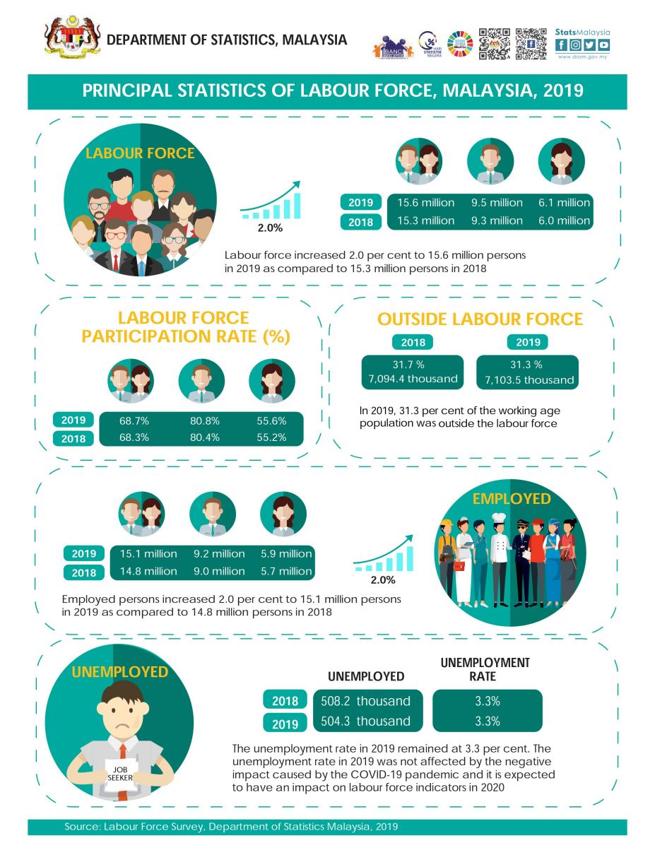 Labour force in Malaysia increased 2.0 per cent to nearly 15.6 million persons in 2019 as compared to 15.3 million persons in 2018. Employed person increased 297.4 thousand persons in 2019.