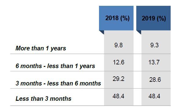 In 2019, 48.4 per cent active unemployed persons were unemployed for less than three months and 28.6 per cent between three months to less than six months. Meanwhile, 9.3 per cent were active unemployed persons of more than one year.