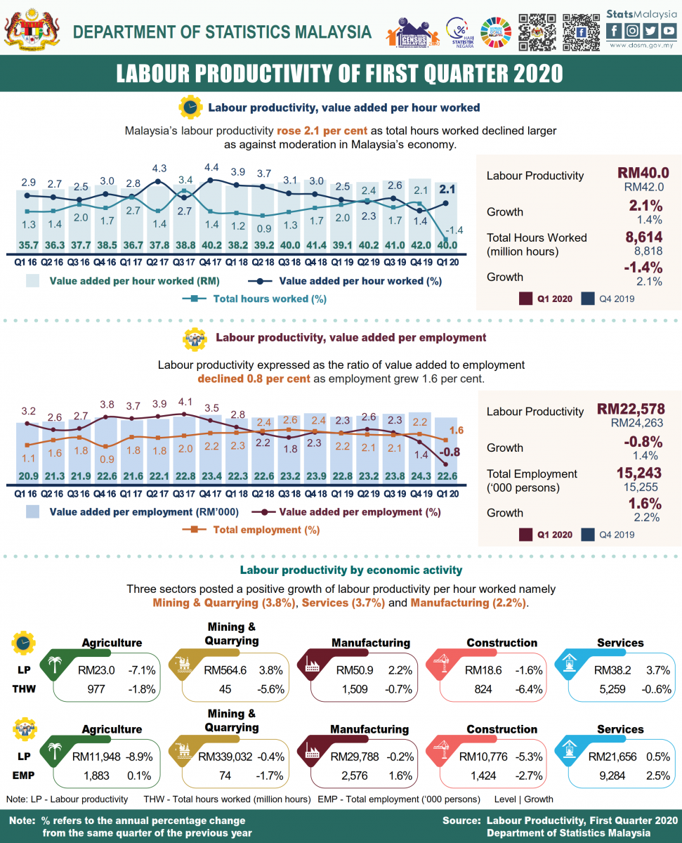 In the first quarter of 2020, Malaysia’s labour productivity, as measured by value added per hour worked rose 2.1 per cent after registering 1.4 per cent in the preceding quarter. The increase in labour productivity for this quarter was due to decline in hours worked larger as against moderation in Malaysia’s economy. During this quarter, value added grew marginally by 0.7 per cent (Q4 2019: 3.6%) while hours worked decreased 1.4 per cent as compared to 2.1 per cent in Q4 2019. In the meantime, employment increased at a slower rate of 1.6 per cent (Q4 2019: 2.2%). Thus, labour productivity expressed as the ratio of value added to employment declined 0.8 per cent (Q4 2019: 1.4%), the lowest growth since first quarter of 2016. In terms of labour productivity level, value added per hour worked in Q1 2020 was RM40 per hour (Q4 2019: RM42 per hour) while value added per employment was RM22,578 per person (Q4 2019: RM24,263 per person).