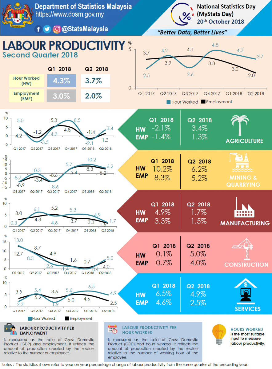 Malaysia’s labour productivity, as measured by value added per hour worked, rose 3.7 per cent year on year in the second quarter of 2018 after registering 4.3 per cent in Q1 2018. During this quarter, Malaysia’s economy expanded 4.5 per cent (Q1 2018: 5.4%) while hours worked increased 0.7 per cent (Q1 2018: 1.0%).
