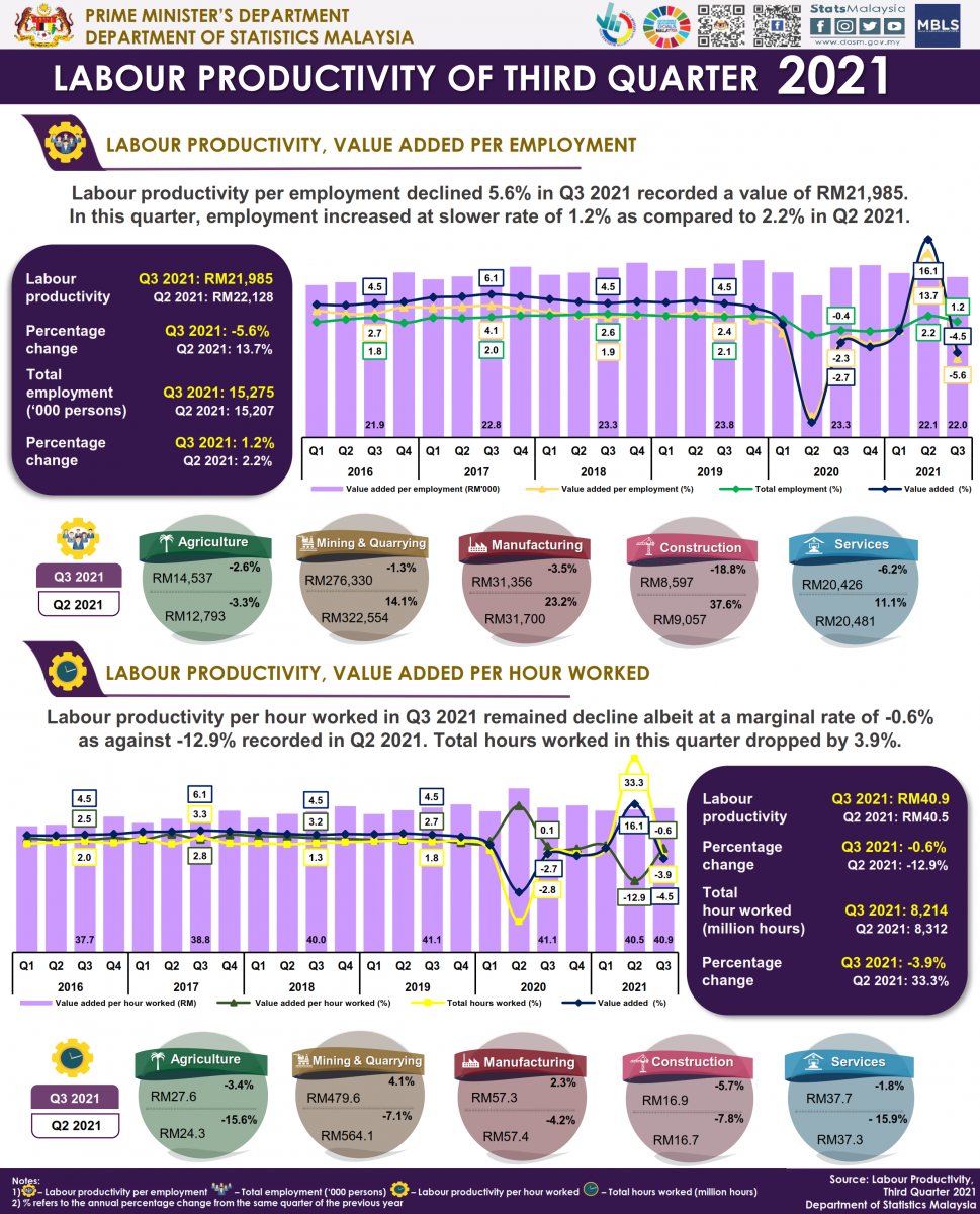 The detailed information and technical notes are published in the publication of Labour Productivity Third Quarter 2021. This report is accessible and downloadable free of charge through the eStatistik application in DOSM web page, www.dosm.gov.my.
