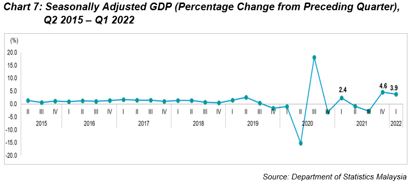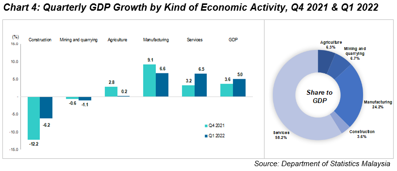 In terms of sectoral performance, the Services sector continued to be the main impetus with a robust growth of 6.5 per cent (Q4 2021: 3.2%). The expansion was fuelled by stronger growth in major sub-sectors, such as Transportation & storage, Wholesale & retail trade and Food & beverage. Nevertheless, Finance descended 2.1 per cent (Q4 2021: 1.2%) in this quarter. The overall Services sector expanded by 5.5 per cent (Q4 2021: 5.1%) in terms of seasonally adjusted.