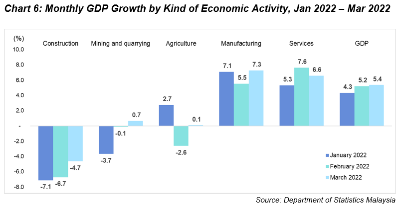 The Manufacturing sector elevated 6.6 per cent (Q4 2021: 9.1%) in the first quarter of 2022. The favourable performance was mainly driven by major sub-sectors namely Electrical, electronic & optical products at 15.4 per cent (Q4 2021: 16.4%), Non-metallic mineral products, basic metals & fabricated metal products at 5.3 per cent (Q4 2021: 5.8%) and Wood products, furniture, paper products and printing at 6.6 per cent (Q4 2021: 5.6%). Nevertheless, Petroleum, chemicals, rubber & plastics products declined 0.5 per cent (Q4 2021: 6.5%) in this quarter. Additionally, this sector grew 1.8 per cent (Q4 2021: 6.6%) in terms of seasonally adjusted.