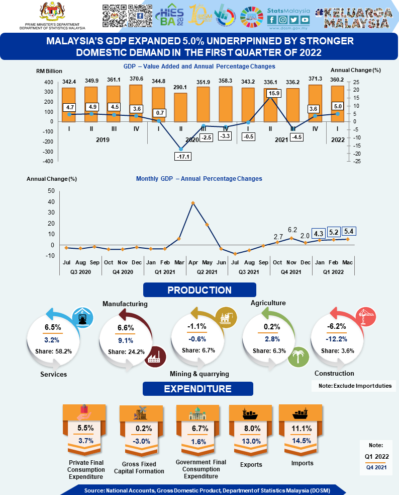 The full publication of Gross Domestic Product, First Quarter 2022 can be downloaded through eStatistik portal.