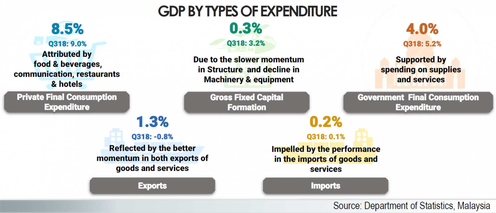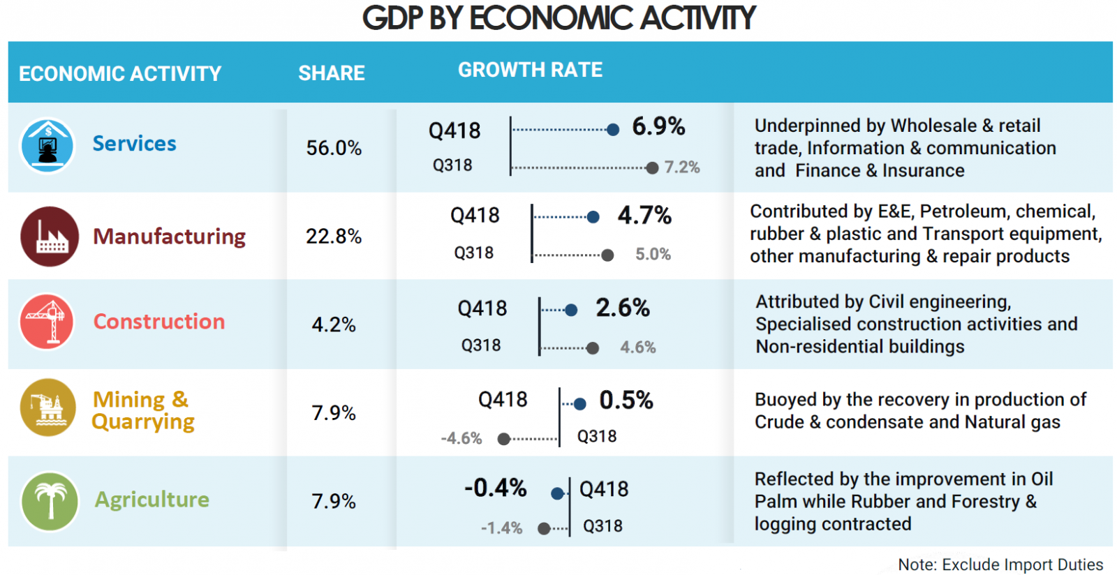 In the fourth quarter of 2018, Malaysia's economy recorded a better performance with a growth of 4.7 per cent after the moderation of two consecutive quarter in 2018. All key sectors recorded positive growth except for Agriculture. The favourable performance was mainly contributed by Services and Manufacturing sectors, whereas Mining & Quarrying rebounded in this quarter. The growth of demand was led by Private final consumption expenditure and Net exports.
