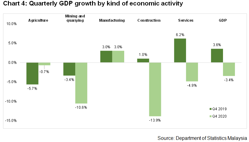 In the fourth quarter of 2020, Agriculture sector slightly dropped 0.7 per cent due to the contraction in Oil palm, Fishing, Forestry & logging and Rubber sub-sectors. However, the Livestock sub-sectors increased in this quarter to a better positive trend as compared to previous quarter. Mining & quarrying sector continued to decline 10.6 per cent in this quarter attributed by the decline in production of Crude & condensate and Natural gas due to the lower market demand.