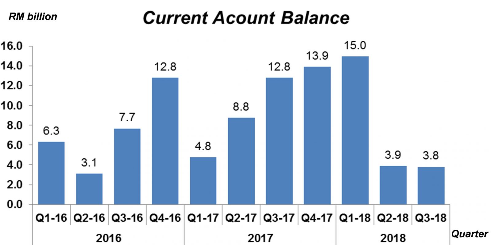 Malaysia’s current account surplus recorded RM3.8 billion as compared to RM3.9 billion in the previous quarter. The slightly lower surplus was largely attributable to the widening deficit in net primary income due to higher retained earnings by the foreign investors.