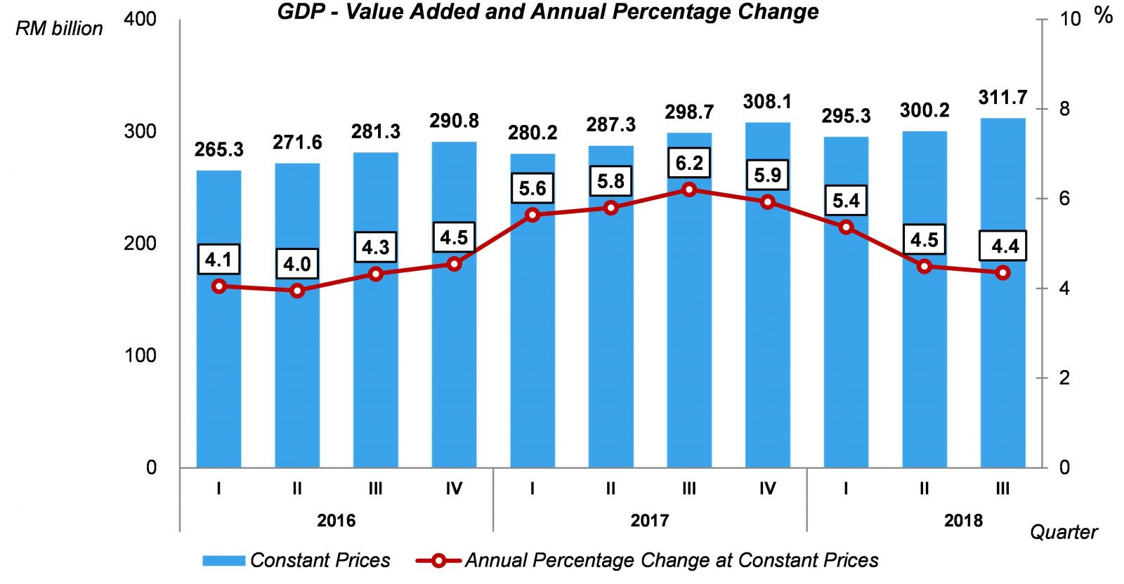 For the first three quarters of 2018, Malaysia’s GDP moderated to 4.7 per cent with a value of RM907.2 billion at constant prices and RM1,055.2 billion at current prices.